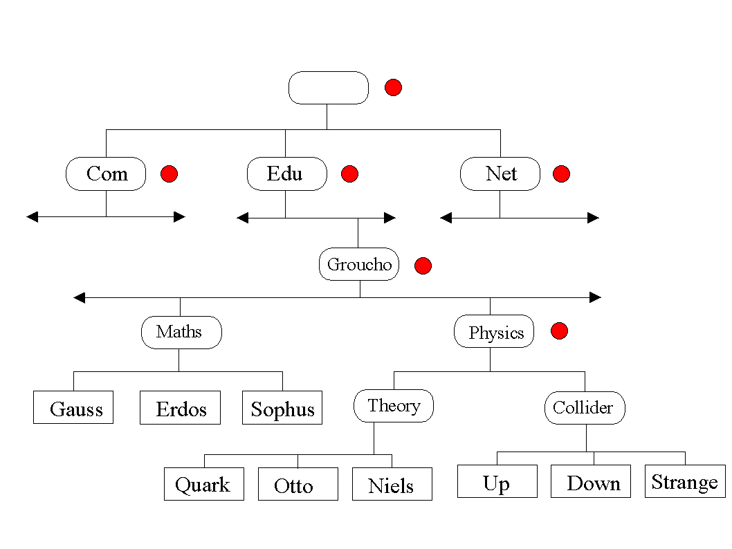 Aquí se muestra una sección del espacio de dominios. La entrada de la raíz del árbol, que se indica con un punto rojo, se puede denominar dominio raíz, y agrupa al resto de los dominios. Para indicar que un nodo se expresa en notación FQDN, se puede terminar el nombre en un punto, indicando así que el nombre incluye al del dominio raíz. (Figura 6)