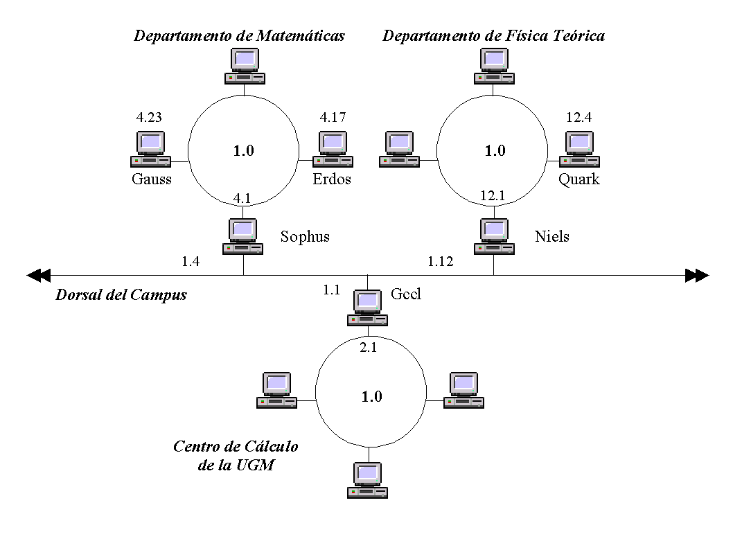 Tomaremos como ejemplo una red típica: la de una universidad, concretamente la hipotética Universidad Groucho Marx (GMU). En esta universidad, la mayoría de los departamentos mantienen sus propias redes de área local, mientras que algunos comparten una, y otros poseen varias. Todos ellos están interconectados, y están enganchados a Internet a través de un solo enlace de alta velocidad.